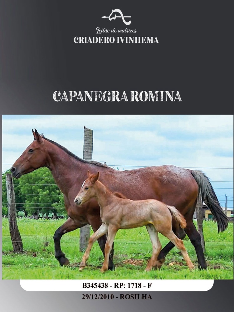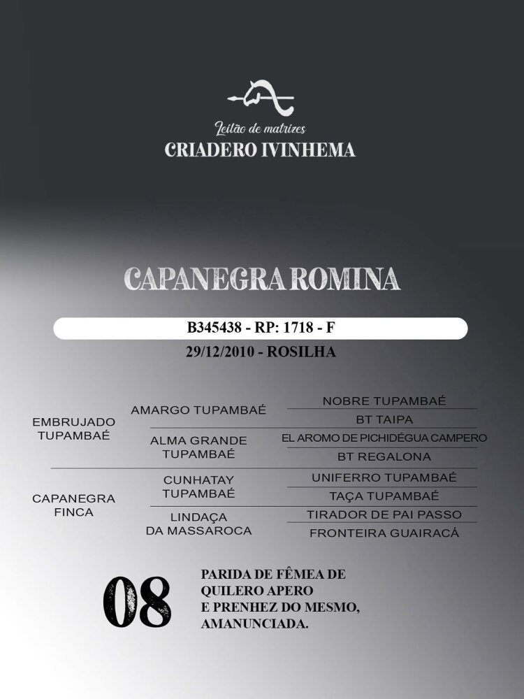CAPANEGRA ROMINAPai: EMBRUJADO TUPAMBAÉMãe: CAPANEGRA FINCAObs: CUNHATAY TUPAMBAÉ