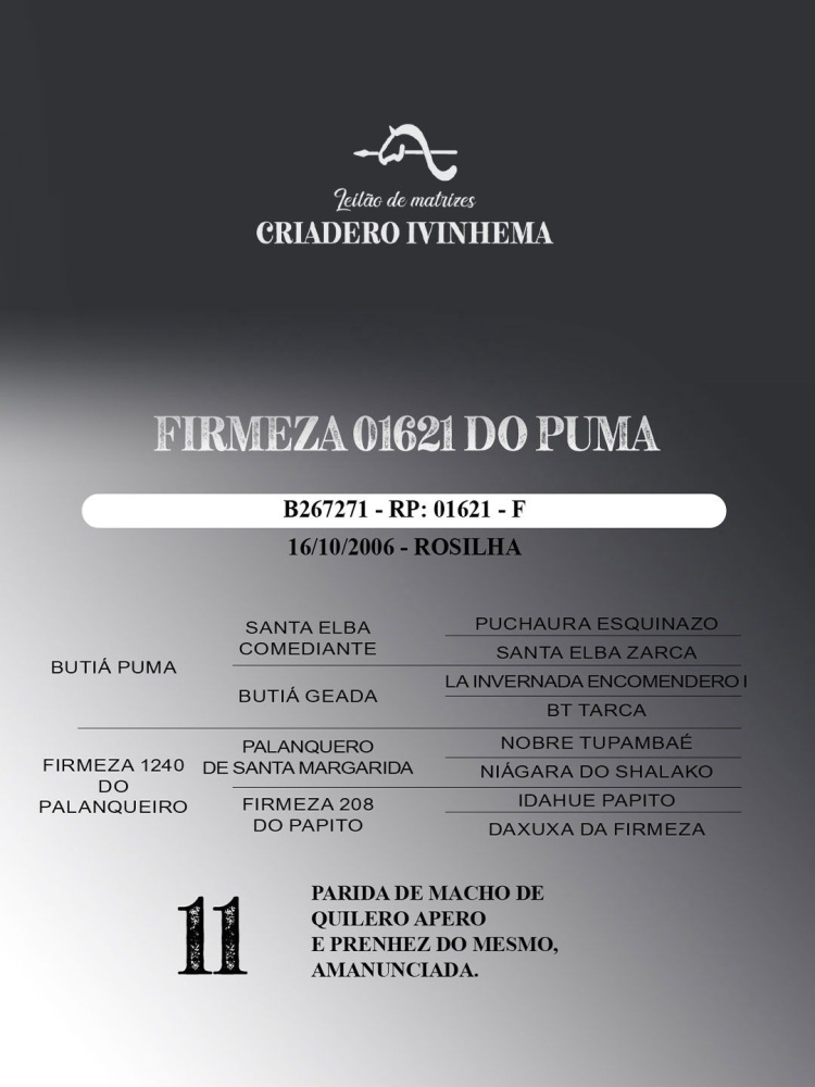 FIRMEZA 01621 DO PUMAPai: BUTIÁ PUMAMãe: FIRMEZA 1240 DO PALANQUEIROAvô materno: PALANQUERO DE SANTA MARGARIDA