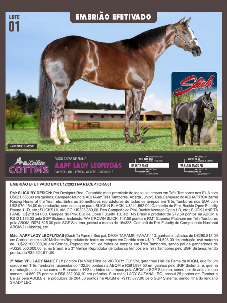 EMBRIAO EFETIVADO Pai: SLICK BY DESINGMae: AAPF LADY LEOFLYDASAvo materno: DASH TA FAMEEfetivado em 01/12/2021 receptora 01