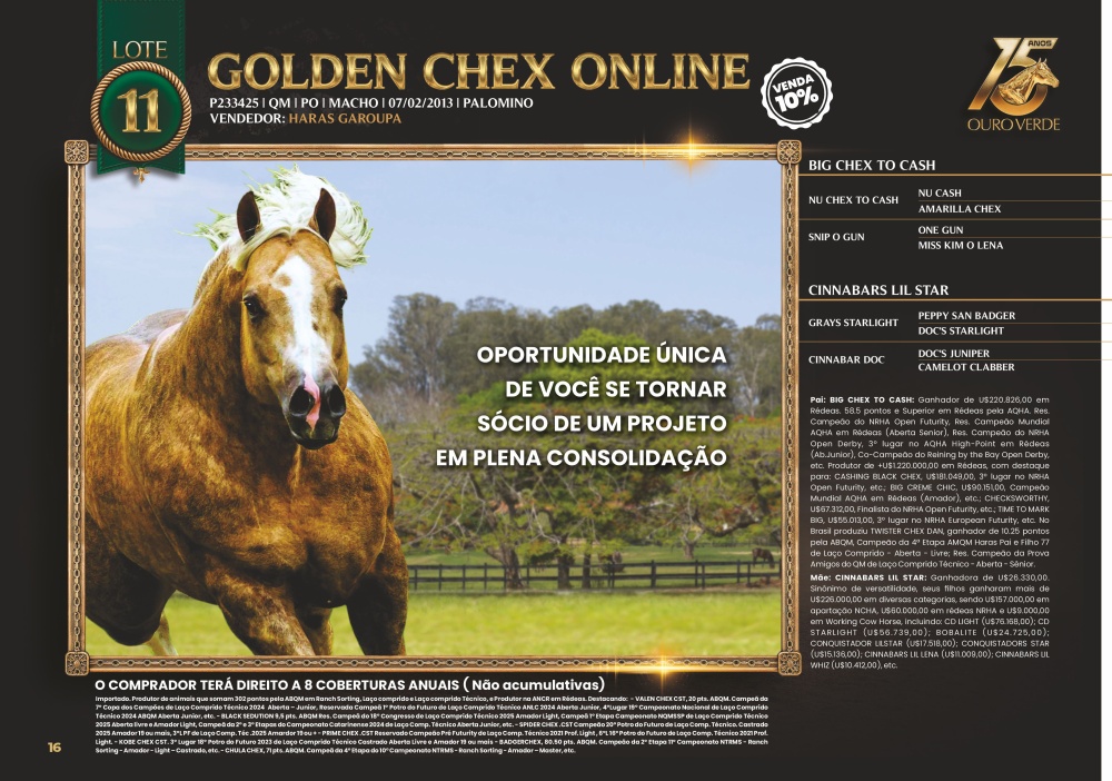 GOLDEN CHEX ONLINEPai: BIG CHEX TO CASHMãe: CINNABARS LIL STARAvô materno: GRAYS STARLIGHT VENDA DE 10%